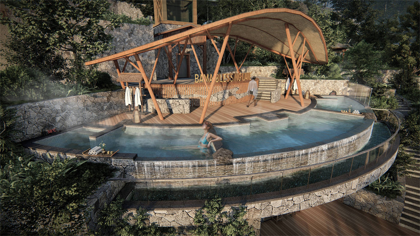 巴马地磁温泉中心坐落于巴马赐福湖畔,建筑面积约9300平方米,总投资1.2亿元,拥有34个特色温泉池,包括理疗汤池、无边叠级山崖泡池和私人汤屋等。温泉水源自地下2500米,含有27种微量元素,在医学及健康领域中被认为可能对消脂减肥、改善皮肤状态以及长寿有益。此外,巴马地磁温泉的地磁强度位于0.58至0.9高斯之间,属于高地磁场范畴,或对促进血液循环,增强人体免疫力具有正向作用,并在一定程度上激发细胞活性,是一处集休闲养生、医疗保健于一体的综合性温泉度假胜地。